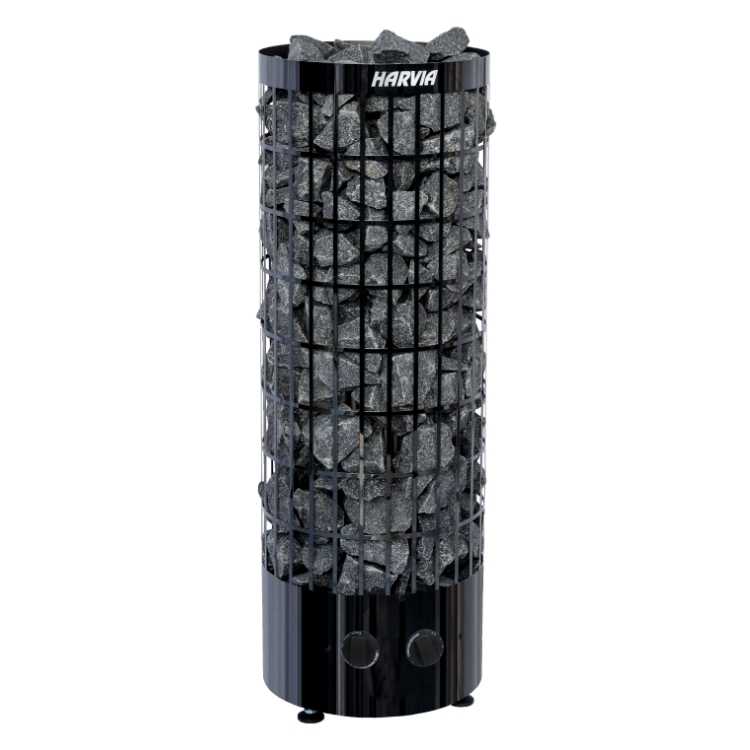 Harvia Cilindro heater in beautiful Black Steel colour is an elegant and stylish heater suitable for smaller and medium-sized saunas. The heater’s perforated outer shell is made of stainless steel and the heater can hold a large amount of stones. These features together enables the steam adjusting. The steam will be softer when throwing the water on the side of the heater and sharper when the water is thrown on top of the stone pillar. The heater is installed on the floor. If the sauna designer wants to add a little more to the sauna, the heater can be immersed into the sauna benches or installed next to a glass wall.